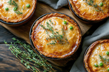 Golden mini chicken pot pie muffins with a flaky crust and creamy filling of chicken. AI generative.