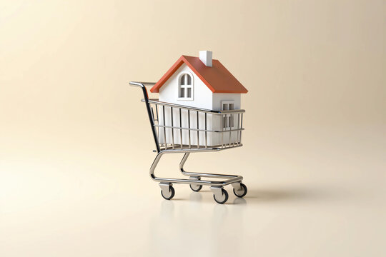 Close-up of hand holding an empty mini shopping cart over a gray background.