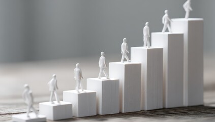 Miniature figures ascending a stairway of white blocks