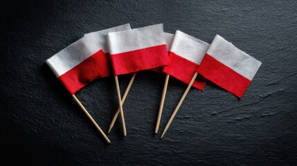 Miniature Polish flags arranged on a dark background for a cultural celebration or national event