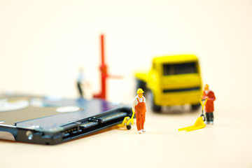 Miniature people: Worker repairing circuit board ,electronics repair. Use image for support and maintenance business.