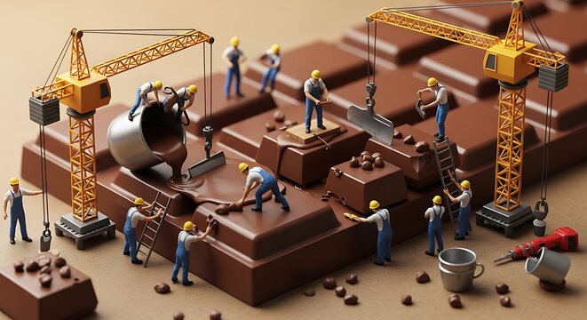 Miniature workers construct and refine a giant chocolate bar, using cranes and tools amidst molten chocolate and chocolate pieces.