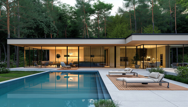 Perspective modern house with terrace, swimming pool on green forest view background. Minimal architecture design with chaise longue. Luxury facade and large panoramic windows. 3D rendering exterior.