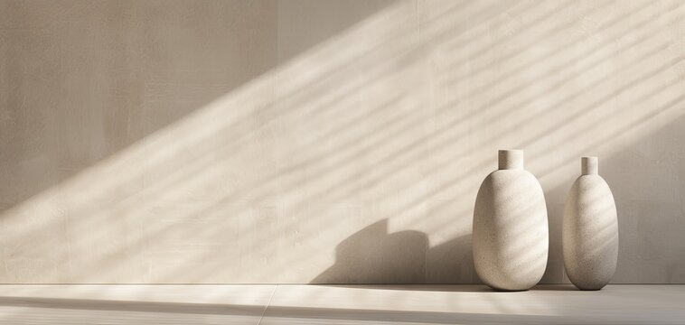 Two light stone shapes form a sculpture on a table, with window shadows from outside casting on the wall, creating a minimalistic background in sepia tones and neutral colors.