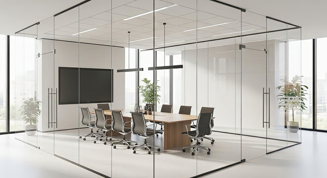 Contemporary corporate meeting room interior glass partitions stylish board table chairs television screen bright office space architecture