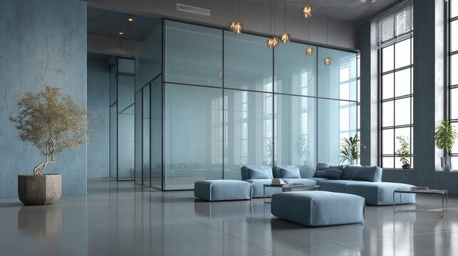 Modern office interior with glass partitions, minimalistic decor, and natural light...