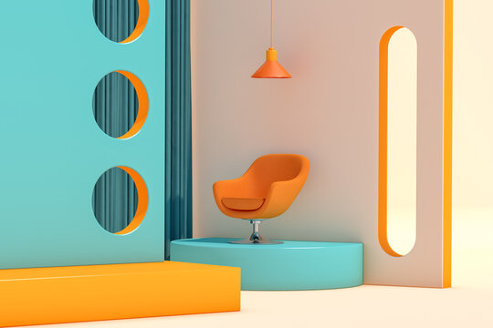 Loft home interior design of modern living room. beige sofa with terra cotta pillows against arched window near stucco wall with copy space.