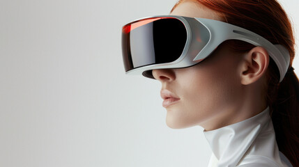 Woman wearing VR headset in bright minimal home interior, experiencing immersive virtual reality, remote collaboration, learning, and next-generation digital lifestyle.