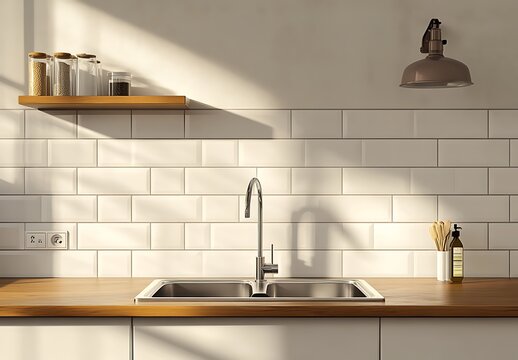 Modern Kitchen Sink With Wooden Countertop And White Tiles