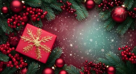 A christmas scene with a red gift box, ornaments, berries, and pine branches on a snowy background
