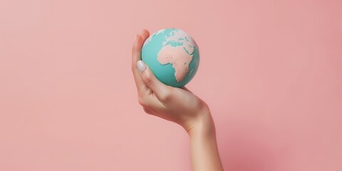 A minimalist composition with a hand holding a small globe model on a pastel pink backdrop, signifying global unity