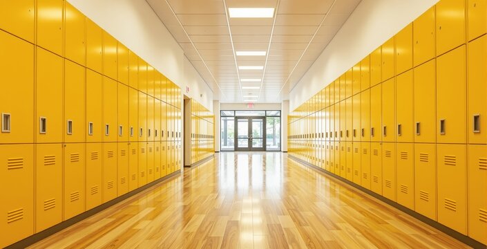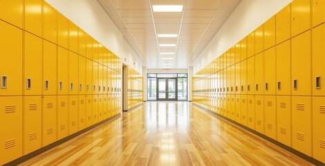Sunlit school corridor gliding paper airplanes over wooden lockers and desks
