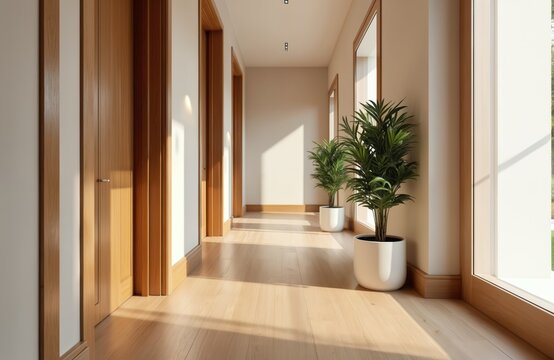 Modern luxury apartment hotel corridor with wooden doors and potted plants lining the walls. Bright minimalist interior design, light wood flooring, natural light, calm atmosphere.