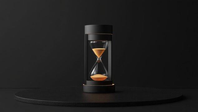 Minimalist red hourglass with sand flowing on light grey background symbolizing time, deadline, patience, and countdown concept