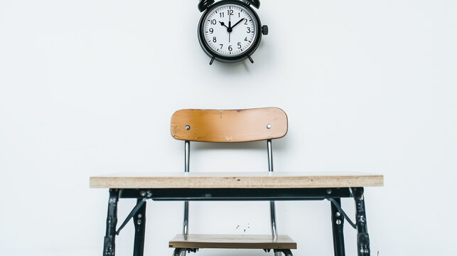 A minimalist chair and table in white space with a floating stopwatch, symbolizing the test of time.