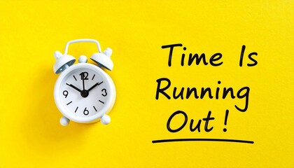 White alarm clock on a bright yellow background with handwritten "Time Is Running Out!" text