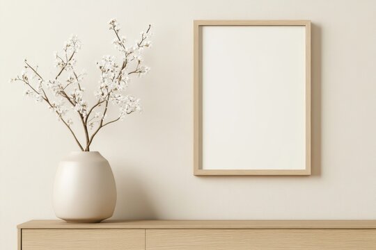 Modern Wooden Frame Mockup in Dining Area with Contemporary Vase on Sideboard