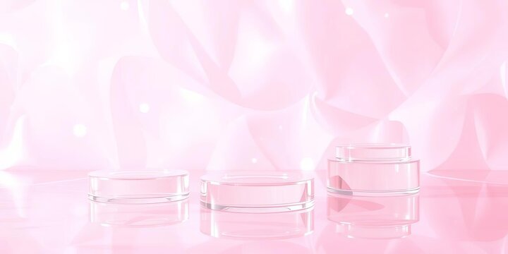 Floating glass platforms on pastel pink holographic backdrop; surreal abstract stage for cosmetics, iridescent, beauty
