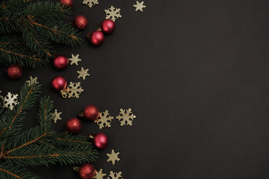 Christmas winter composition. Red balls with fir branches and snowflakes on black background. Top view, flat lay