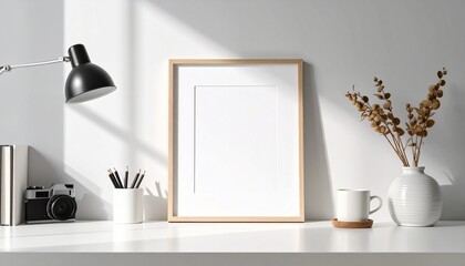 Minimalist home office workspace featuring a blank wooden picture frame mockup on a white desk with a lamp, camera, and dried flowers in natural sunlight