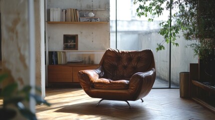 Vintage leather armchair highlighted in a contemporary minimalist loft with large windows, natural light, and greenery, creating a serene and stylish indoor retreat.