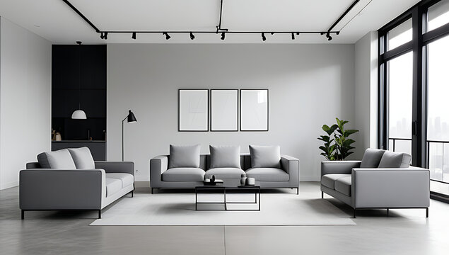 Modern interior design with light empty mock-up wall and gray furniture, loft and vintage of living room
