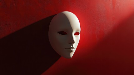 A minimalist white mask is dramatically lit against a bold red textured wall.