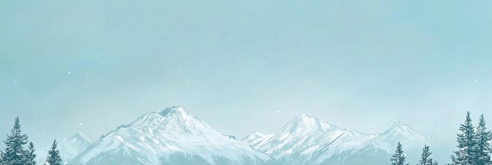 Winter doodle featuring snowy mountains and tall pine trees in a minimalist style with expansive copy space. Generative AI