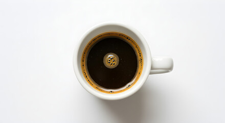 Overhead view of a white cup of espresso on a saucer against a split black and tan background