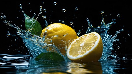 Fresh lemons with water splashes and green leaves on black background highlighted with copy space for text