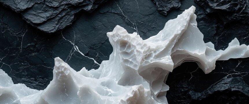Elegant white marble against a textured black background showcasing natural contrasts and patterns in stone design.