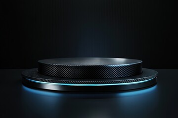 futuristic podium made of carbon fiber displayed on matte black platform under focused light