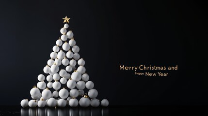 A minimalistic Christmas tree of white baubles on a black background with golden holiday greetings for a festive celebration