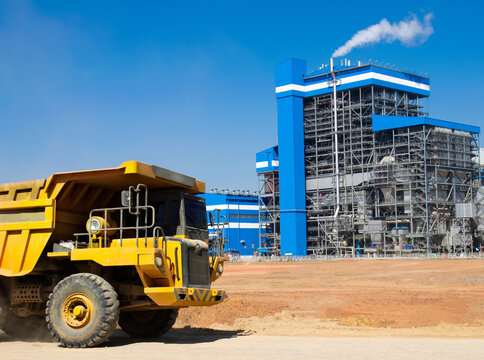 Large trucks transport ore from the mines to feed the industrial plants, Behind is a coal-fired power plant, Trucks are running transport.