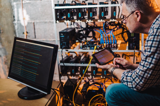 Programmer adjusting cryptocurrency mining rig to optimal operational settings
