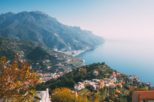 Amazing aerial view of Maiori and Minori along Amalfi Coast in summer season, Italy. Drone viewpoint