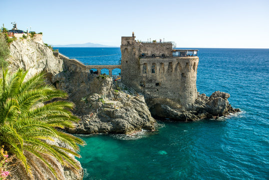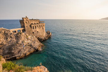 View of Torre Normanna, a medieval tower along Salerno Bay in Maiori, Amalfi Coast, Salerno, Italy.