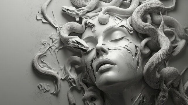 Black and white 3d rendering of medusa with snakes and zombies on a mint background