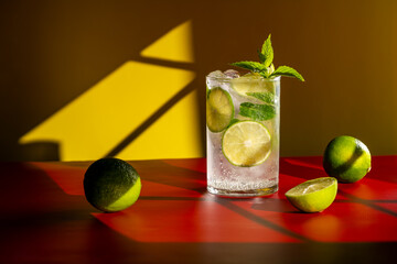 Refreshing lemon mint drink with ice and fresh citrus slices on light blue background