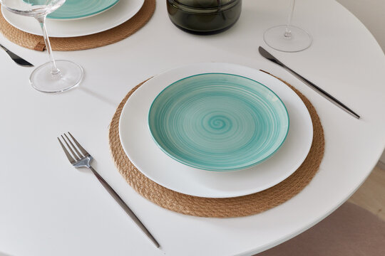 Elegant Dinner Setting with Mint Green Plates and Silver Cutlery on a Light Blue Background