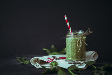 Fresh green smoothie with kale and avocado on rustic table