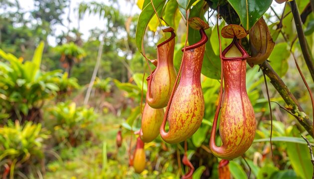 Cluster of tropical pitcher plants hanging with green leaves, blurred background
