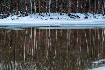 Full moon reflecting on tranquil winter lake by snow-covered forest