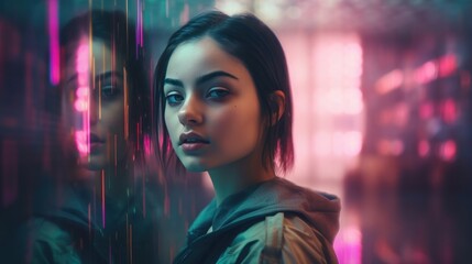 silhouette of a person standing in a modern mirror maze with glowing blue and red neon lights creating reflective and mysterious atmosphere