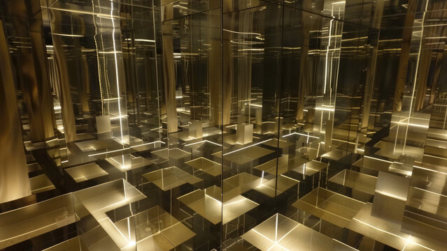 Twisting and turning mirror maze with endless reflections, illusion, confusing, distorted, reflection, disorienting