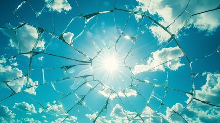 Broken mirror shards reflecting distorted images, scattered on a dusty surface.