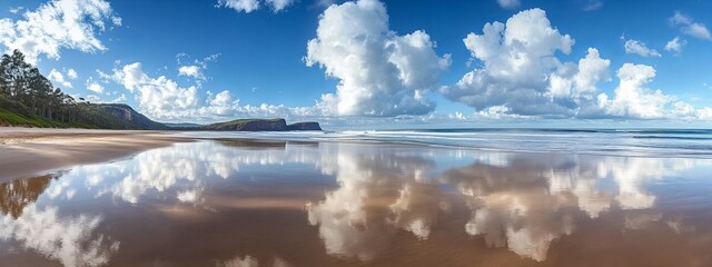 A tranquil lake with soft, fluffy clouds floating above, perfectly mirrored in the calm waters, creating a serene and picturesque landscape.