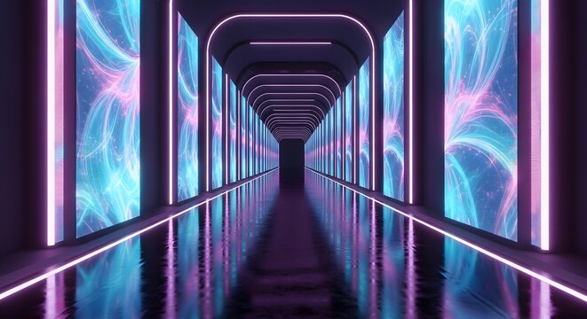 Futuristic digital displays, mirrored corridor