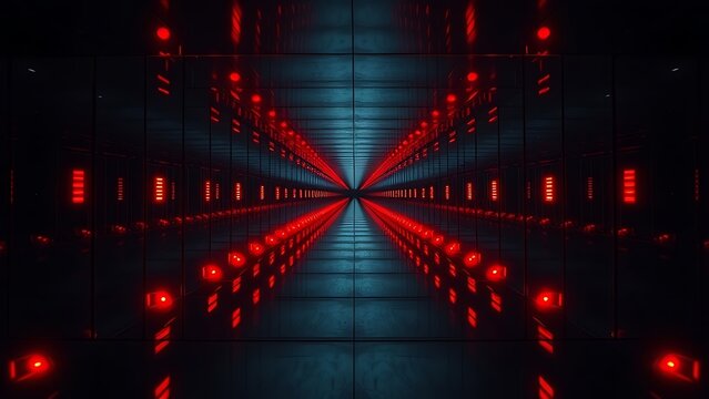 Futuristic abstract tunnel with mirrored panels and soft glowing light bands creating endless reflections