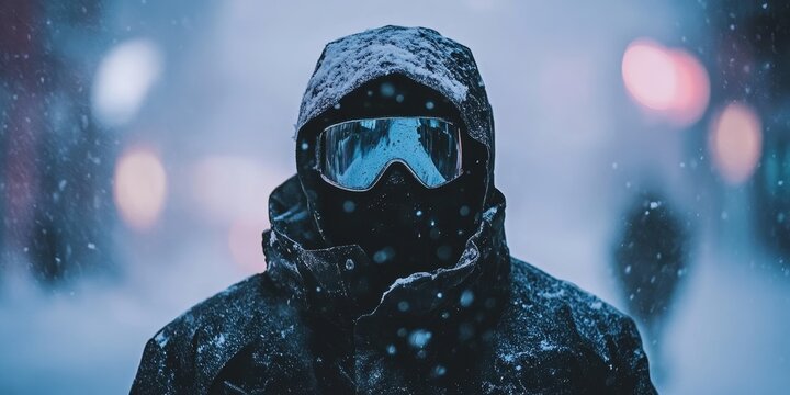 Stylish snowboarder wearing mirrored goggles, enjoying winter in a snowy landscape close up.